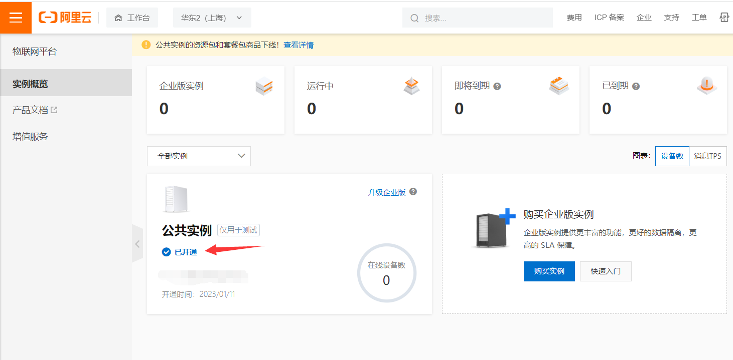 登录并搜索物联网平台,点击按钮开通公共实例,公共实例开通需要两分钟左右