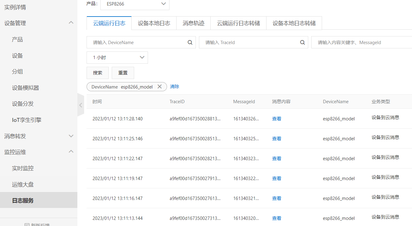10.物联网平台打开设备,并查看日志,发现话题中已经有消息输入了