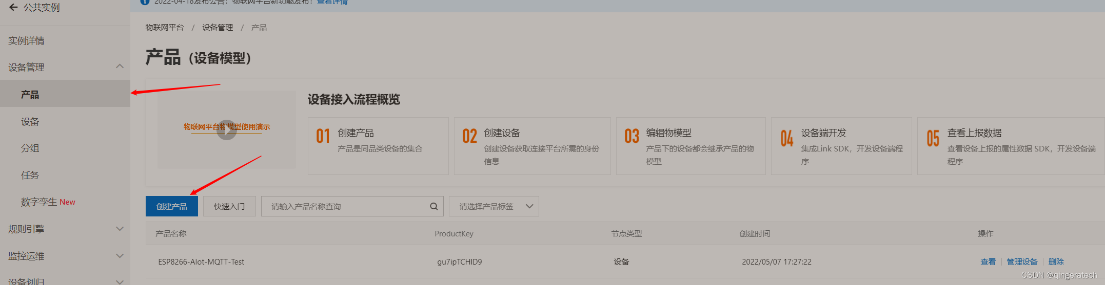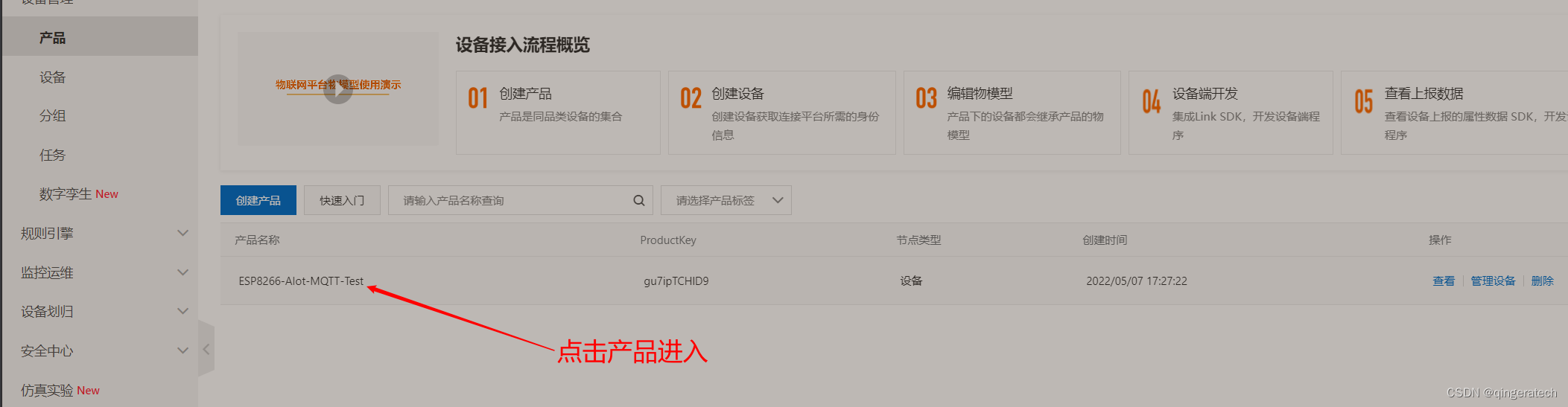 接下去就可以再添加一个设备,用于连接ESP8266,来进行两个设备的通讯以及控制了,只要能连上阿里云其他底下的操作都和连接百度云物联网类似的。