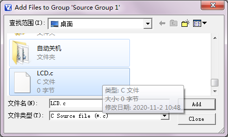 找到之前保存的.c文件,点add,然后关闭。