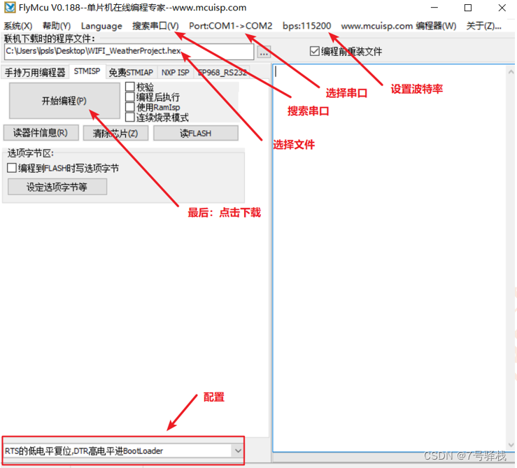 要先安装CH340驱动软件。使用FlyMCU软件下载HEX文件到单片机时,下载器要连接电脑,保证系统板要通电,否则搜索不到串口。