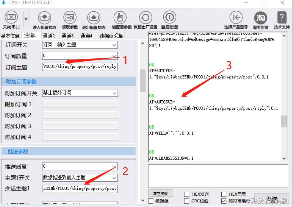 以及图5的位置1为回复topic,位置2位上报topic和位置3为对应的AT指令。