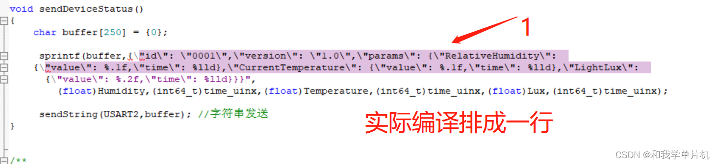 {"id":"0001","params":{"LightLux":{"time":1663962320000,"value":1155.00},"RelativeHumidity":{"time":1663962320000,"value":40.0},"CurrentTemperature":{"time":1663962320000,"value":32.0}},"version":"1.0"},但是如果直接在C语言里发送是发送不过去的,需要用到一个字符串组合函数如图14,为了方便大家看到调用的全部参数为把程序分行了,但是在实际编译的时候要排成一行,要不然编译不通过。