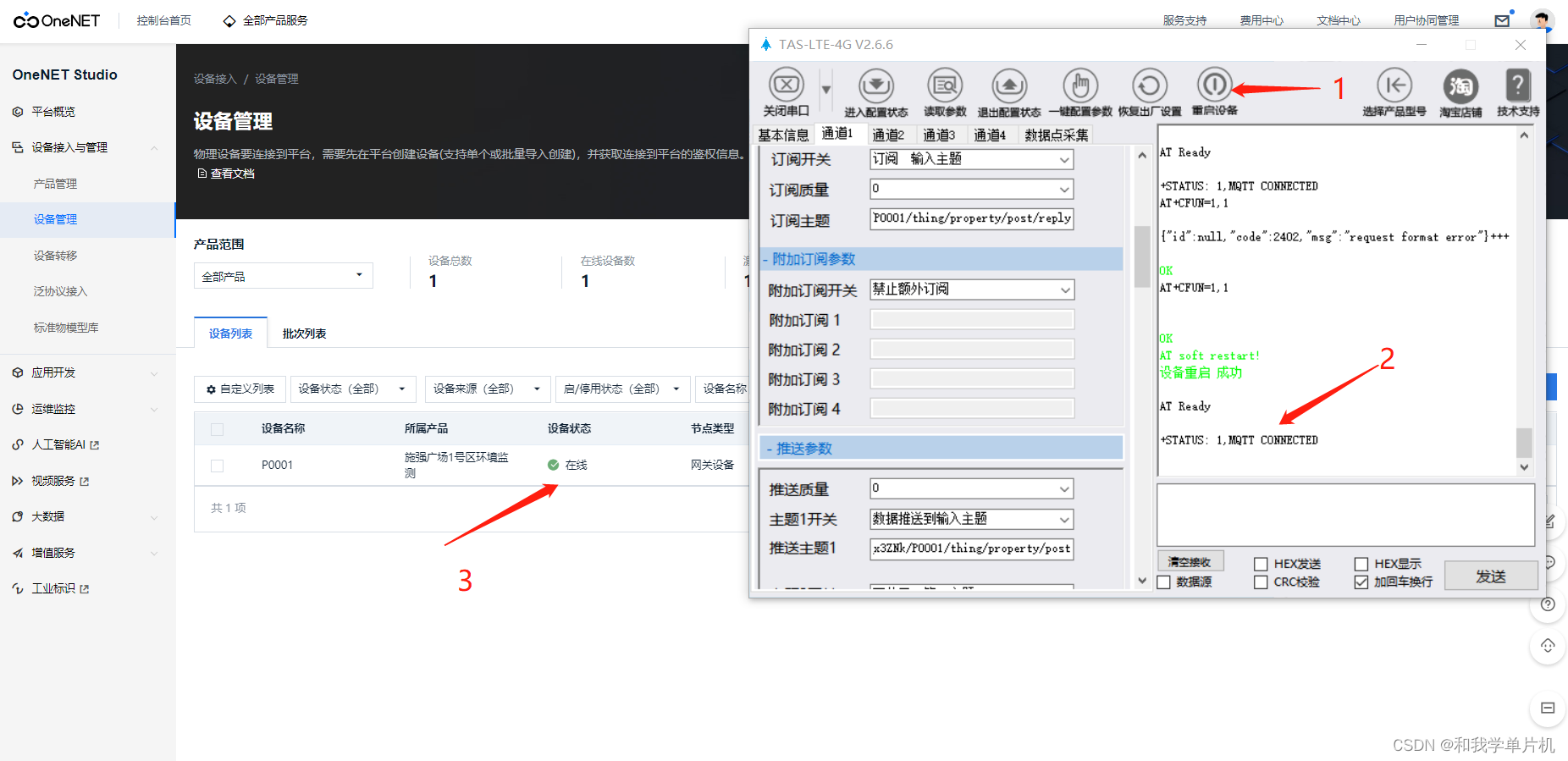 第四步 通过4G模组发送数据到服务器,按指定的数据格式通过串口方式发送出去,如图7的位置1为串口发送的内容就是对应属性JSON格式要发送的数据(这里测试发送的时候我把时间戳修改了当前的时间),图7的位置2为服务器收到数据后回复接收成功的状态信息,图7的3位置看到OneNET Studio平台显示了我们发送上去的数据。