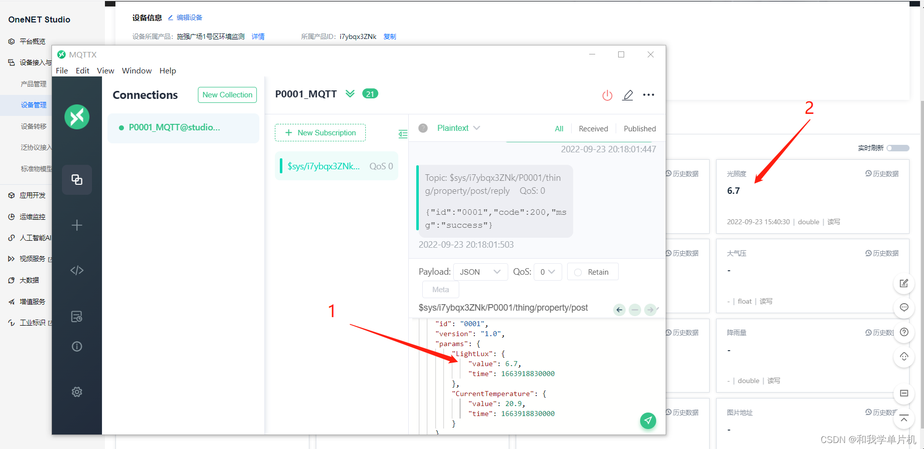 结合OneNET Studio云平台STM32物联网开发(1)- MQTT协议设备接入数据上报测试,这篇文章如图1,图1的1位置是在MQTTX上模拟和OneNET Studio云平台连接以及在相应的通道上上发数据以及接收数据,