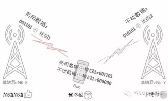 B:看图说话。以下行为例,Bob手机所属基站叫eNB X,旁边一个基站eNB Y发射的信号对于Bob手机来说就是干扰;基站X发送的数据采用扰码1数据加扰,这是有用数据;基站Y发送的数据采用扰码2加扰,这是干扰数据;两个扰码1和2是正交的。