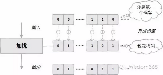 第六步:加扰。输入是一串称为码字的比特流,与一串已知的码序列,称为扰码,进行异或运算就得到输出比特流。