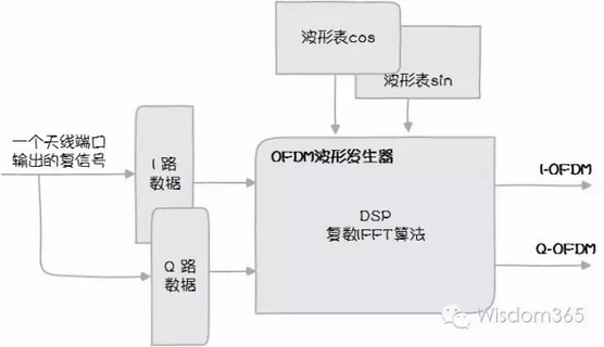 一个天线端口输出的I路和Q路调制数据经过OFDM波形发生器,输出两路OFDM信号,I-OFDM和Q-OFDM,完了。
