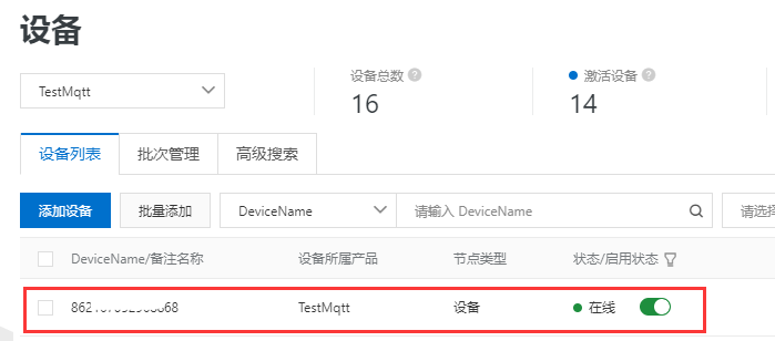 7.在物联网平台上刷新一下设备列表,会看到注册了一个新设备
