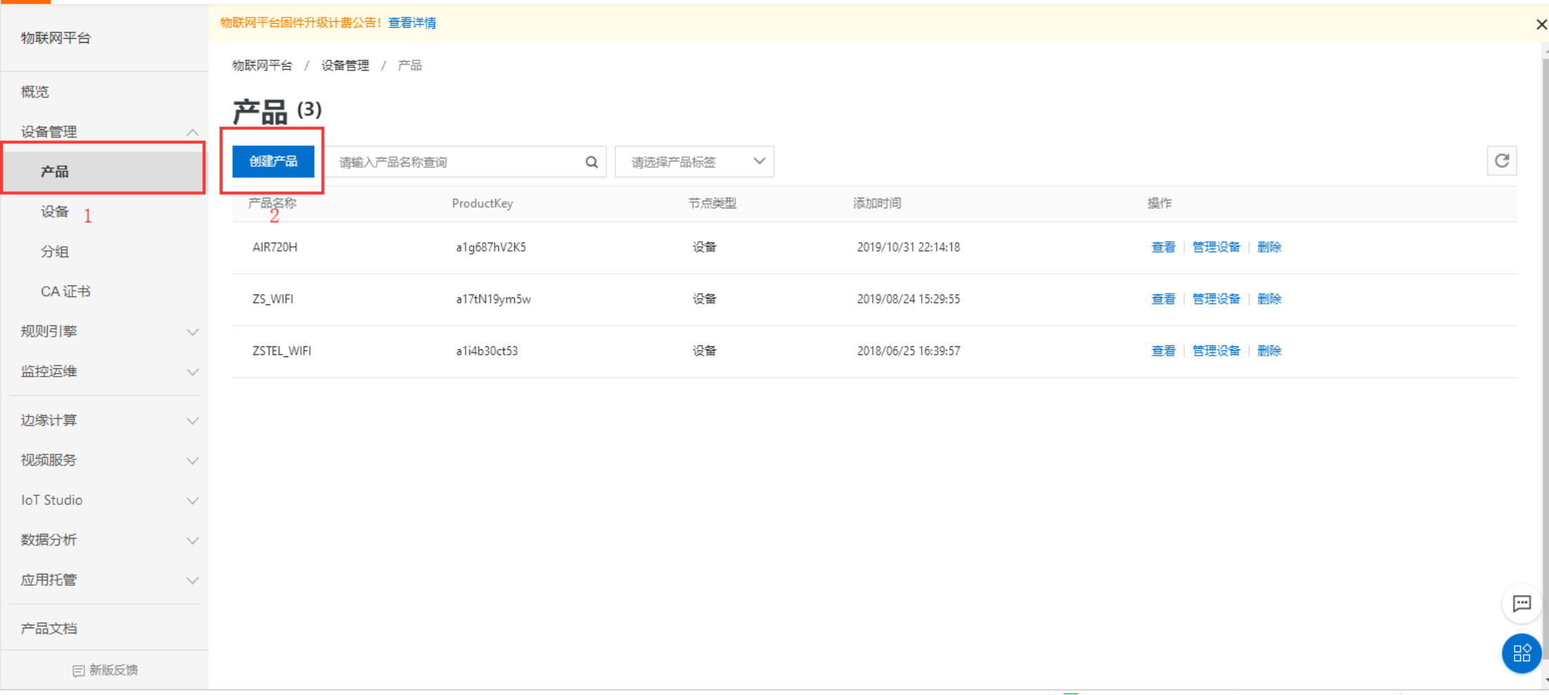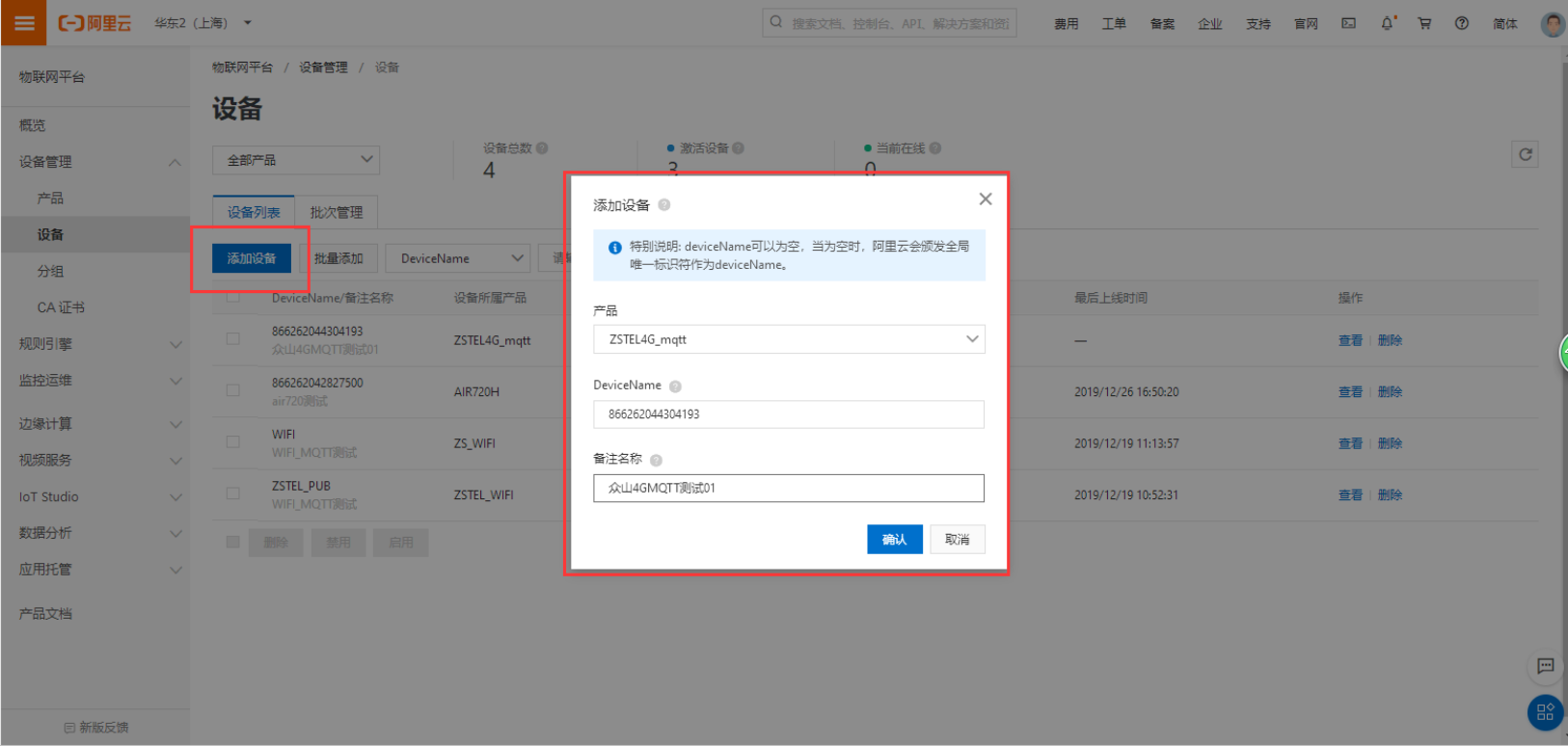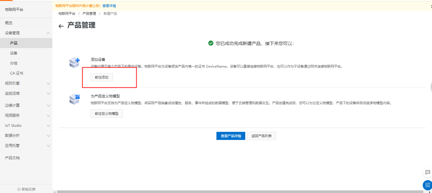4) 产品创建成功后添加设备