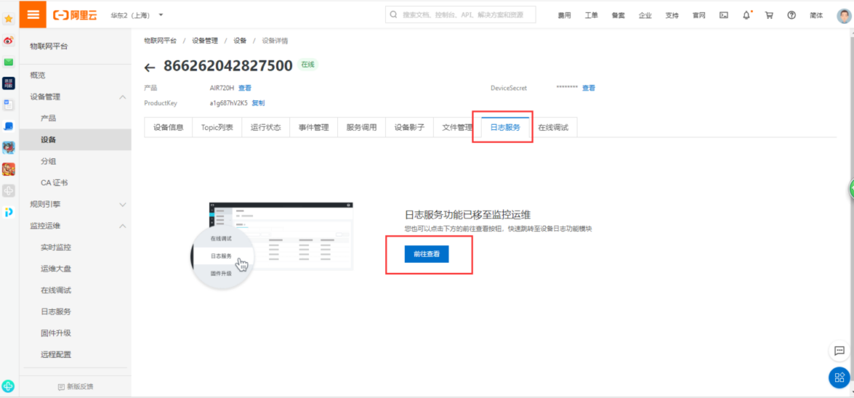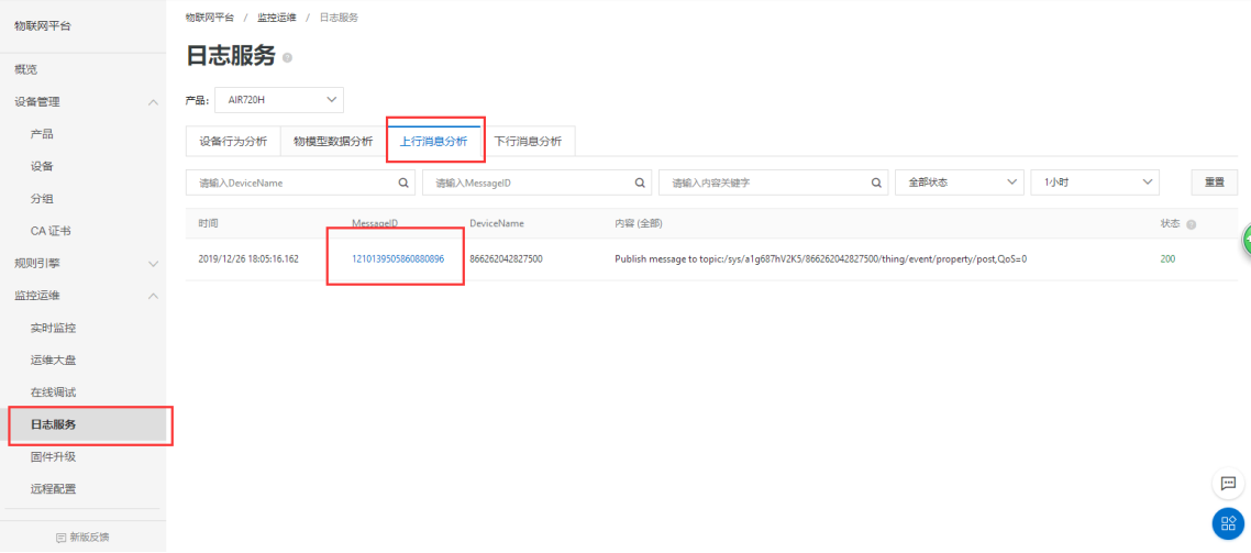 在阿里云IOT后台,切换到日志服务-前往查看-上行数据分析,点击MessageID查看具体的报文信息