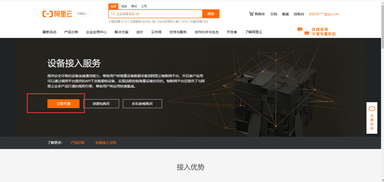 浏览器访问阿里云IOT主页:https://www.aliyun.com