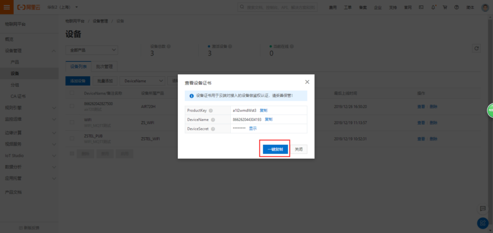 5)添加好设备后会弹出设备鉴权证书,新建一个文本文档,点击一键复制,将信息复制到文档里