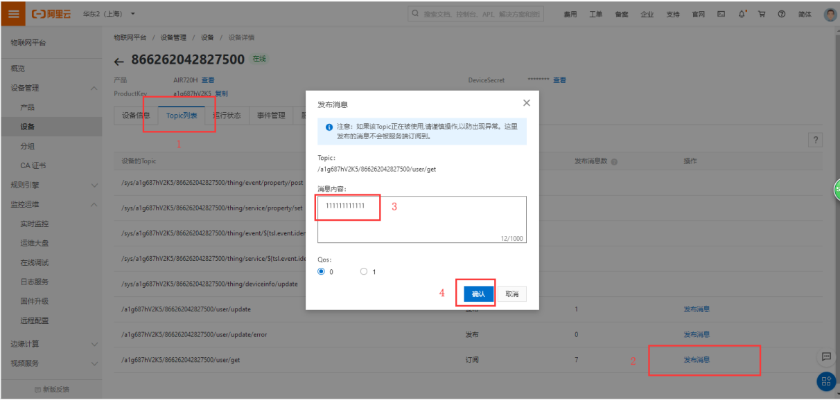 再阿里云平台里面点击设备详情-Topic列表,选择最后一项.../user/get-发布消息,通过发布消息窗口可以向设备发送数据报文。