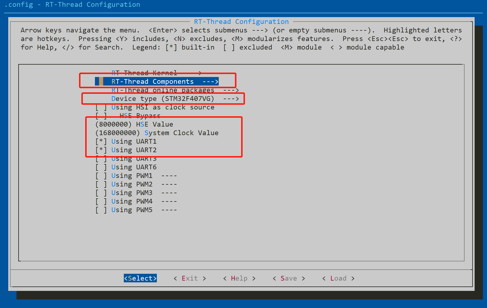 返回到这个菜单中,可以选择下自己使用的MCU型号,配置下系统时钟,还要使能uart1 和 uart2, uart1使用用来打印log信息的以及使用msh命令的时候会用到,uart2是我们前面与EC20模组通讯要用的串口,这里要使能下才能用到,接下来进入到RT-Thread Components的子菜单里进行相关的配置