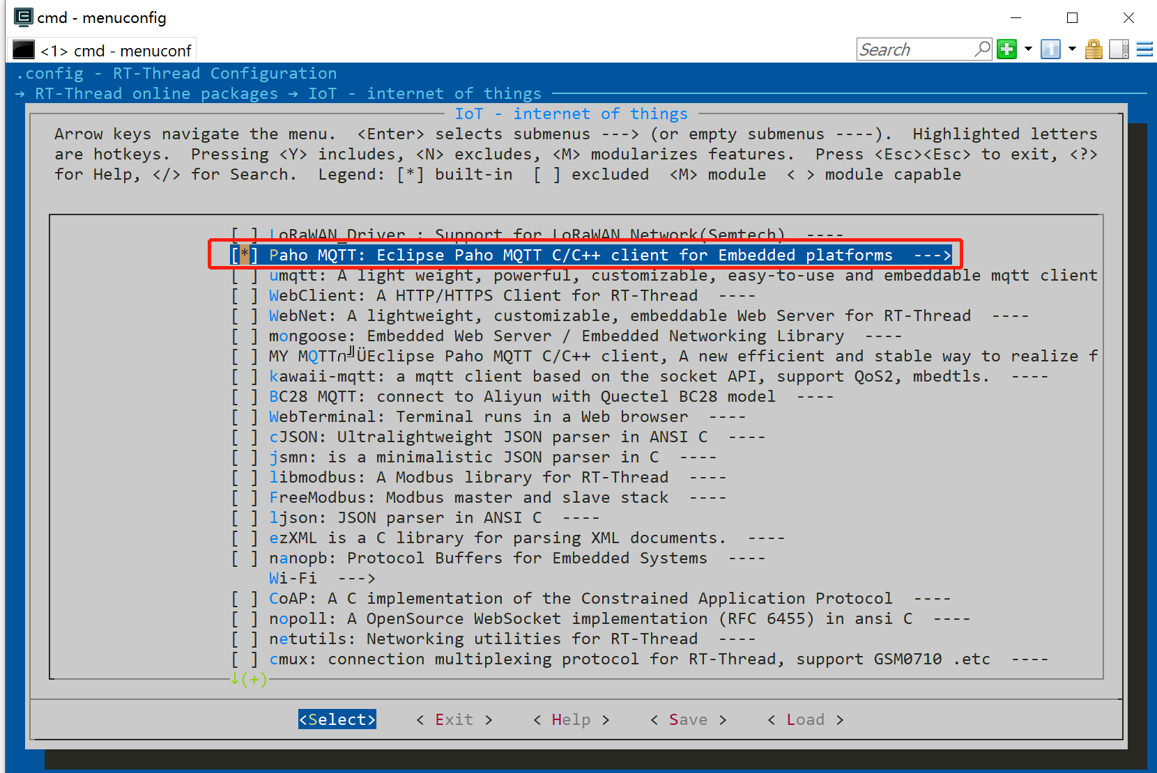 首先在这里我们选择我们需要的组件,通过键盘上的方向键选择到RT-Thread online packages,按下回车键,进入到其子菜单,选择Iot - internet of things ,再次进入到其子菜单,通过方向键移动到paho_mqtt选项上,按下空格键选中,选中后会显示*号,如下图