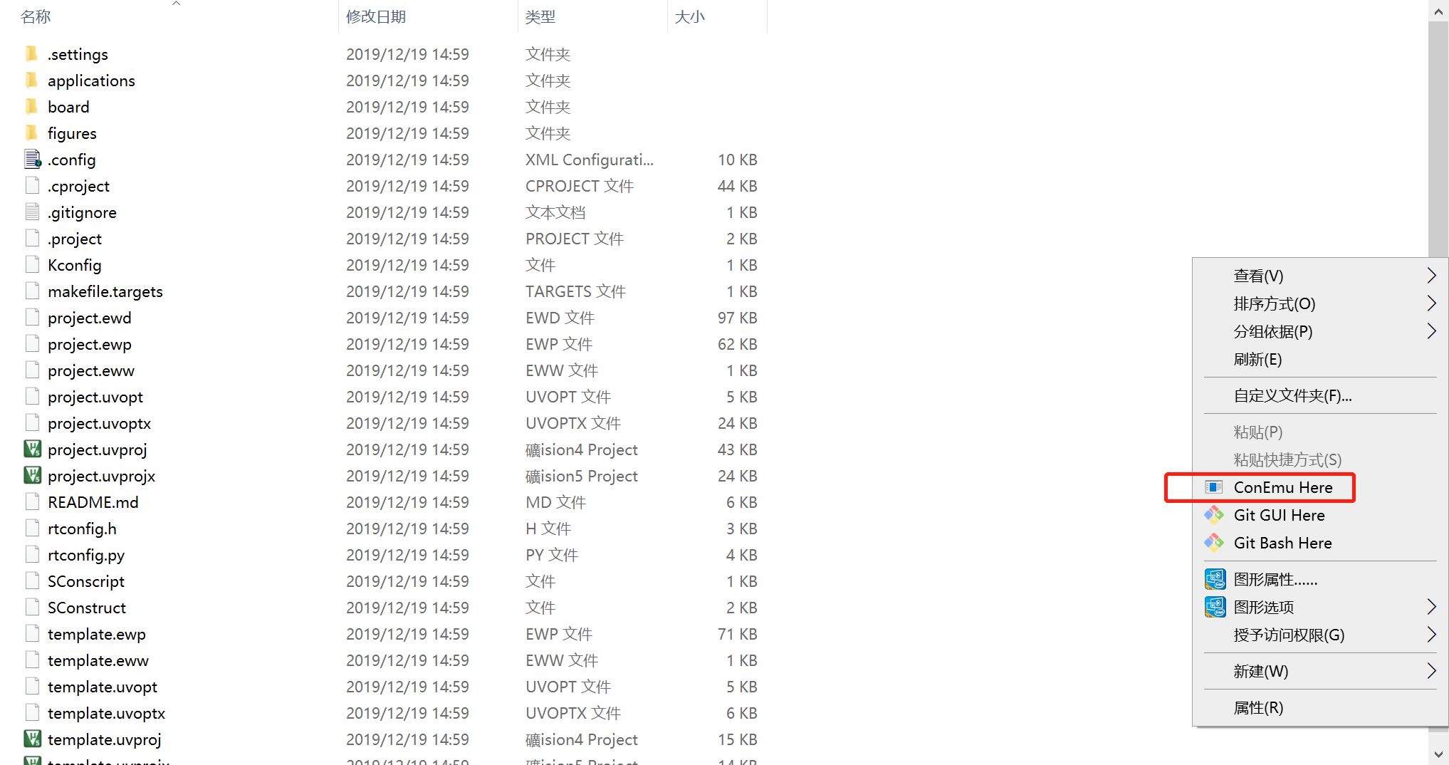 进入到工程里,在空白的区域按下鼠标右键,选择ConEmu Here来打卡ENV工具