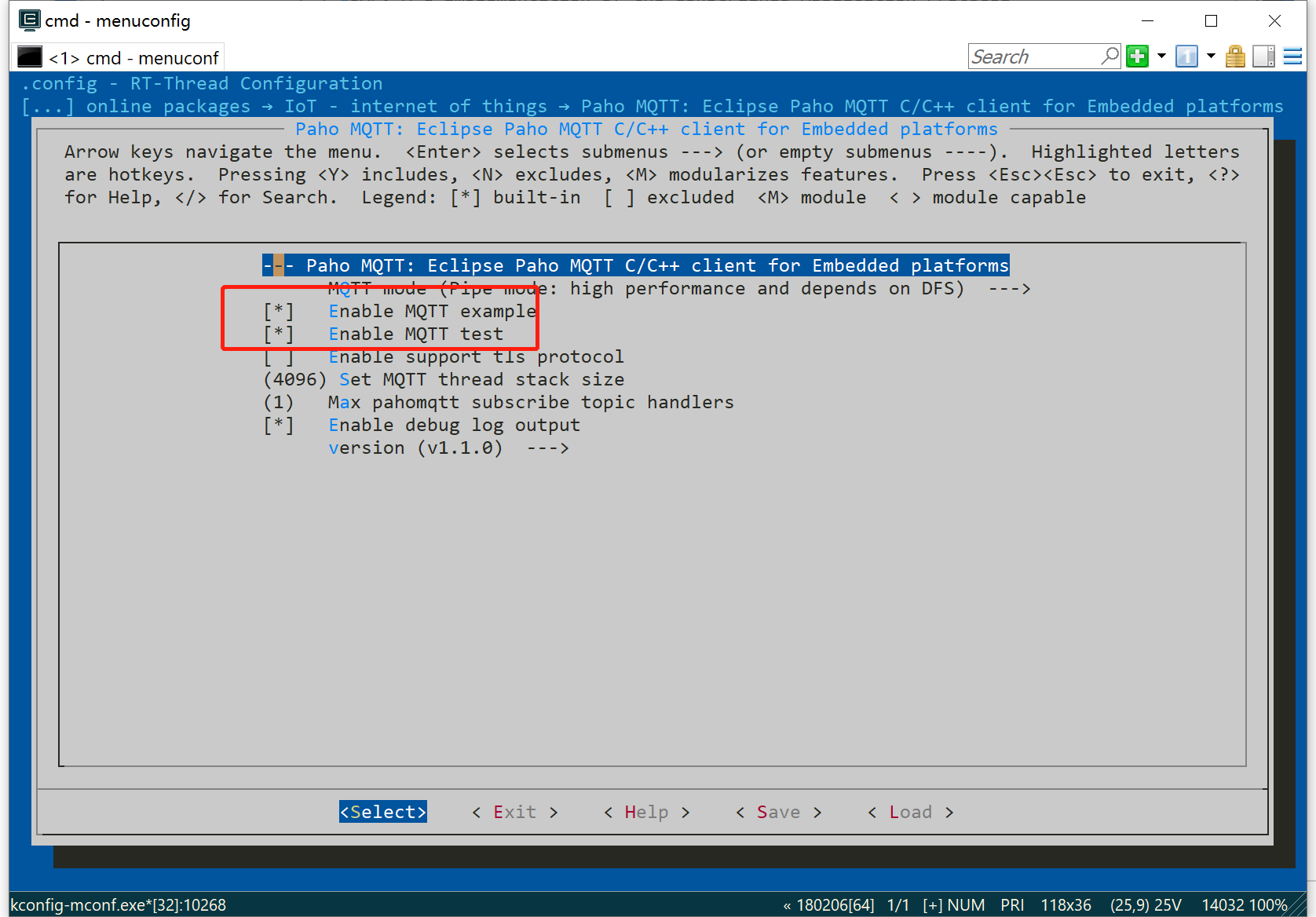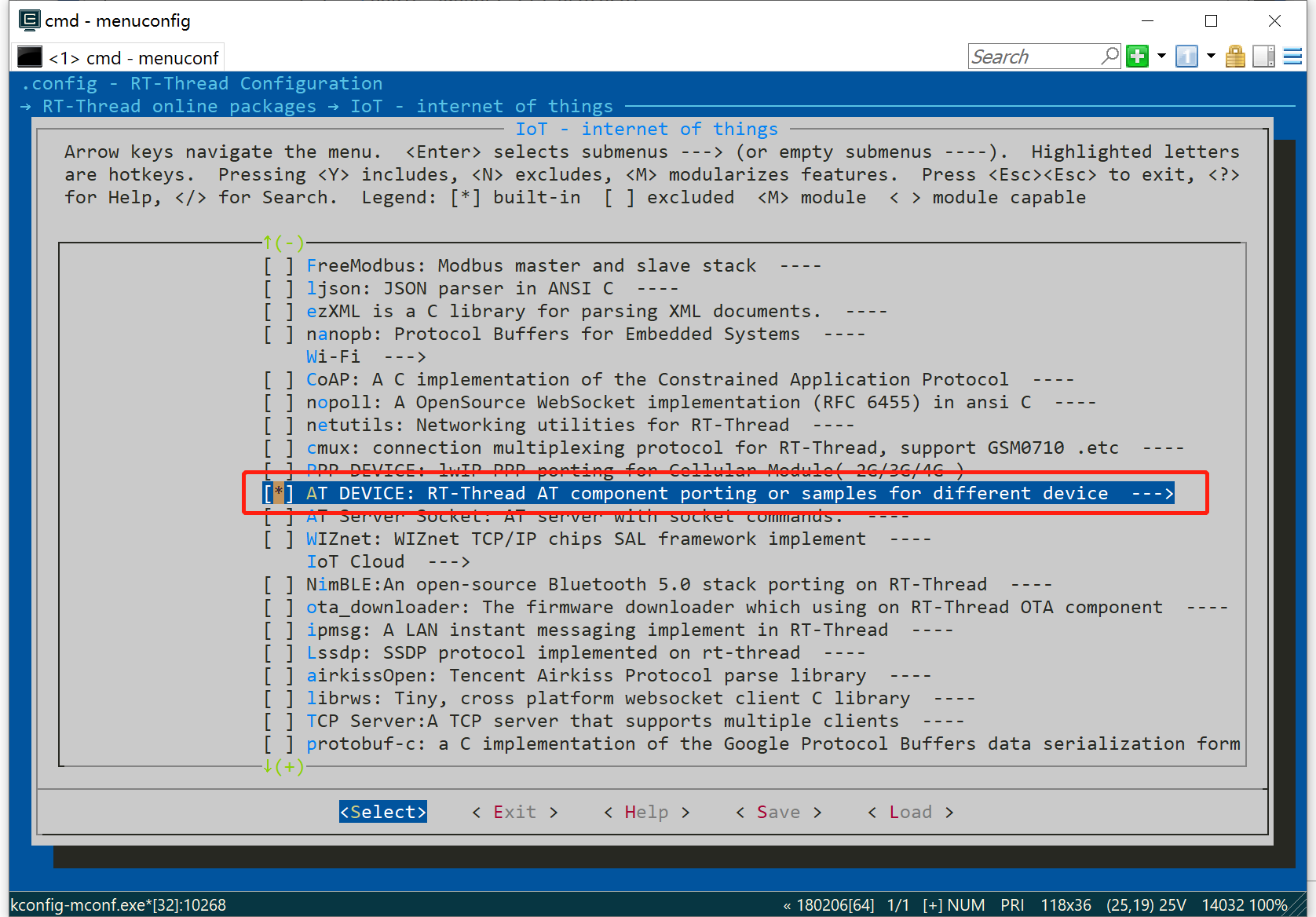 选中后进入其子菜单,对其进行一些配置,选择 MQTT example 和MQTT test这两个选项,操作完成后按下esc键返回上一菜单,找到at_device对其进行配置
