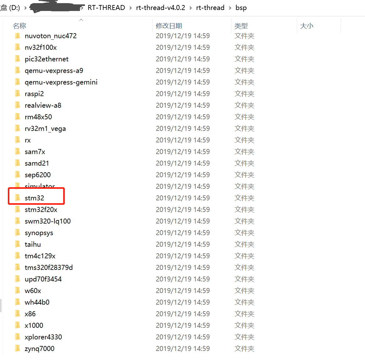 源码包中提供了非常丰富的DEMO资料,我们可以根据自己手里的开发板选择合适的DEMO,我下载的源码包版本是rt-rtread-v4.0.2版本,在bsp文件夹下有很多的DEMO资料包,截图如下