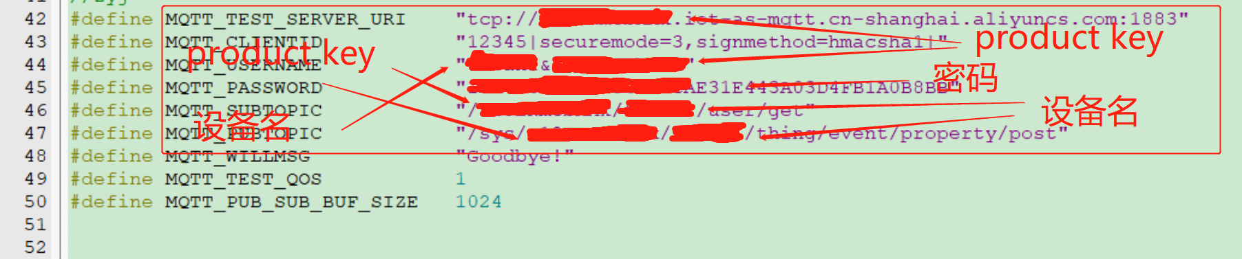 如下图,这里是连接阿里云重要的三元组信息,包括productkey 设备名 转换后的密码,关于这样一块的信息可以查看如下文档连接:https://help.aliyun.com/document_detail/140507.html?spm=a2c4g.11186623.6.571.55977b7bCFSwul,这个连接讲述的是使用MQTT.fx软件测试与阿里云链接,我们实际也是使用的这些信息,用这个软件测试通过后,把这些信息拷贝到keil这里使用