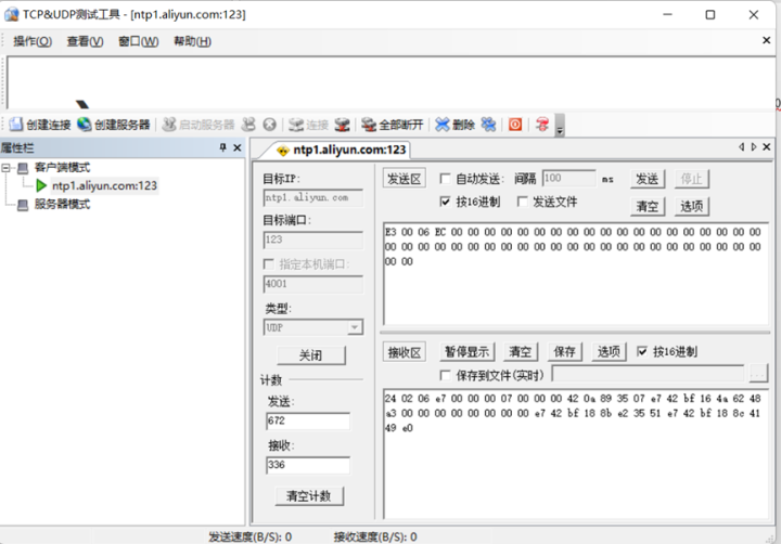 采用本地UDP工具,按16进制发送以上报文,目标服务器选择:ntp1.aliyun.com,目标端口123,连接类型UDP。