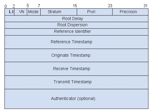 · Authenticator(Optional): 验证信息, 长度为 96 Bits, (可选信息), 当实现了 NTP 认证模式时, 主要标识符和信息数字域就包括已定义的信息认证代码 (MAC) 信息.