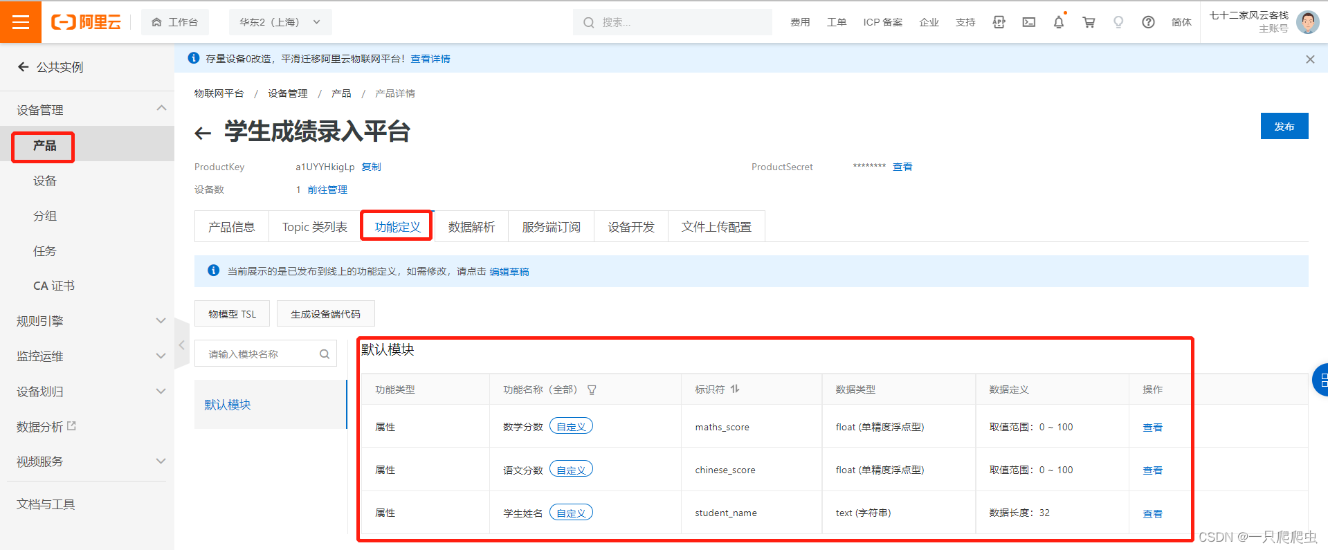 本例创建产品和添加物模型的结果如图所示,产品名称为“学生成绩录入平台”。