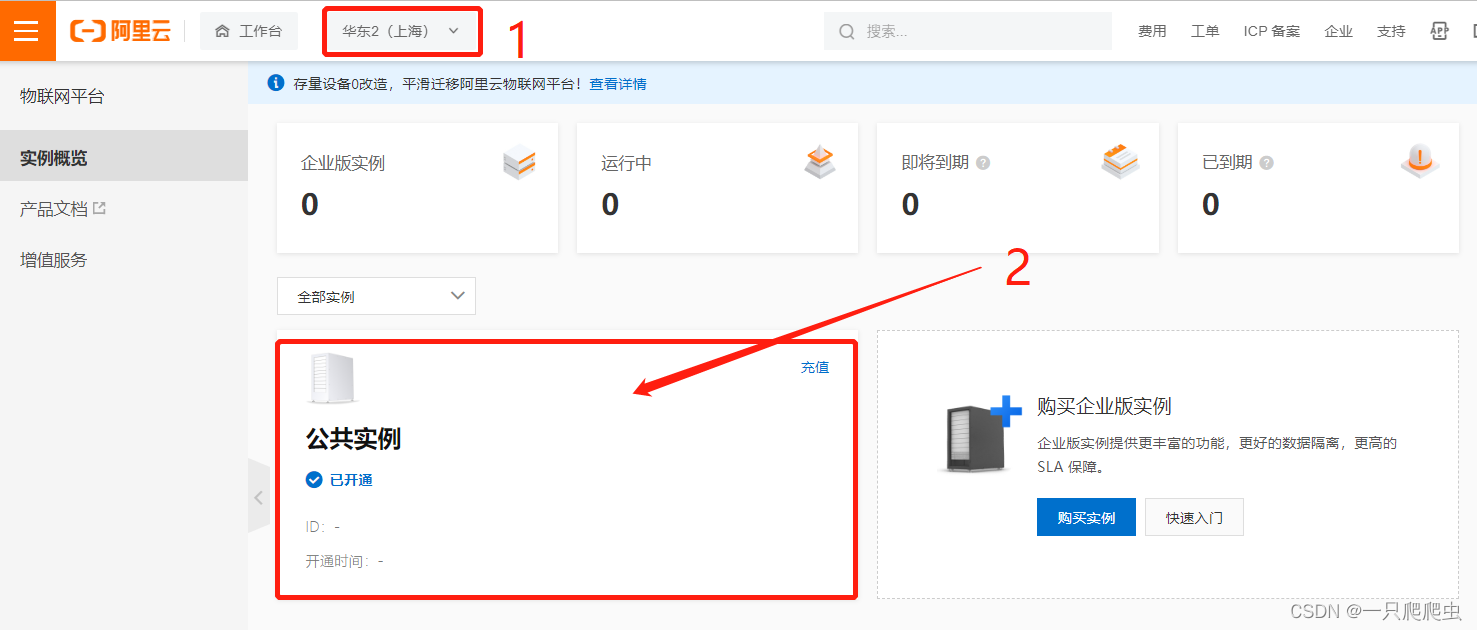 (1)进入物联网平台后,选择华东2(上海)服务器