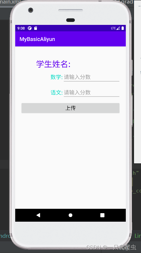 一共有7个控件:4个TextView,分别显示学生姓名、数学、语文的标签,以及学生姓名的具体内容。2个EditText,用来输入数学和语文的分数。1个Button,标签为“上传”,点击后进行publish的功能,将语文、数学的两个分数发送到物联网平台。