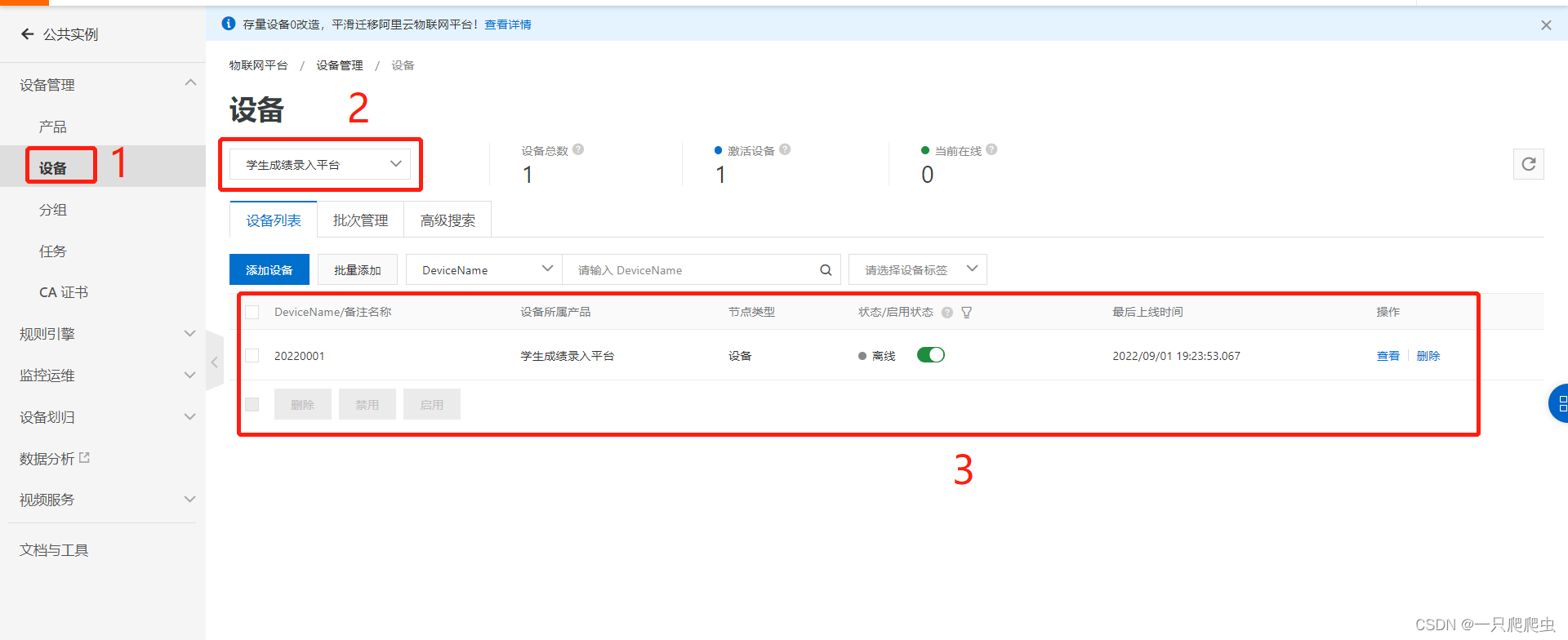 也可以批量添加设备,操作步骤见:批量创建设备 (aliyun.com)
