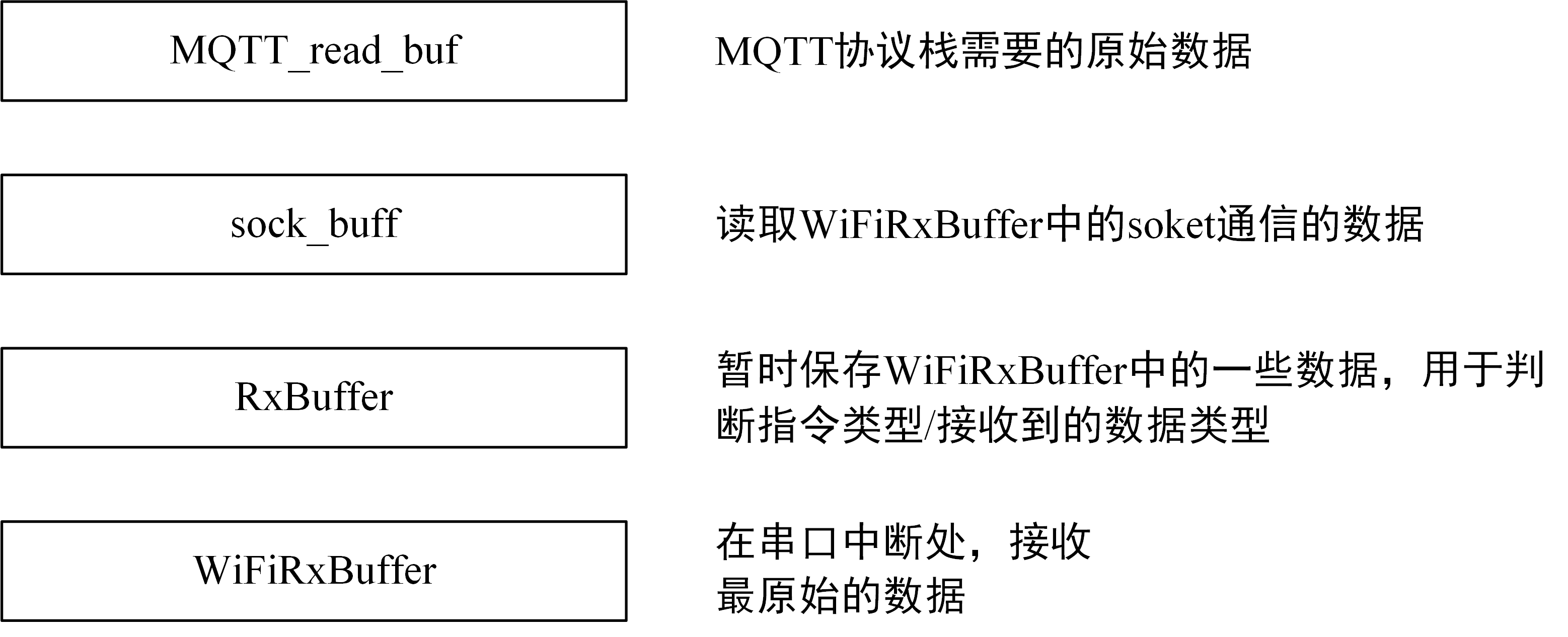 WiFiRxBuffer位于串口中断中,用于存储WIFI模块发送给模块的所有数据(最原始的数据)。而RxBuffer用于判断AT指令的返回值。socks_buffer用于保存TCP客户端发过来的具体数据(+CIPEVENT:SOCKET,1,10,1234567890),而MQTT_read_buf为MQTT协议栈所需要的数据,这样一来也做到数据分层。