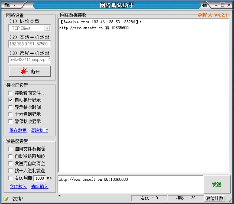 再打开一个网络调试助手作为客户端连入该服务器,所谓内网穿透,简单理解就是,服务器相当于A 家庭,客户端相当于B家庭,内网穿透就是一条魔法通道,时B家庭的人能从这条通道去到A家庭 并连上他家网络