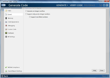 在弹出的对话框中,单击“Speed”,不选“在整数溢出时饱和(Saturate on integer overflow)” 和“支持非有限数(Support non-finite numbers)”, 单击“Close”