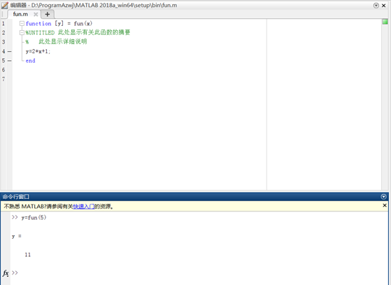 在命令行窗口输入 y=fun(5),得到 y=11,验证算法正确