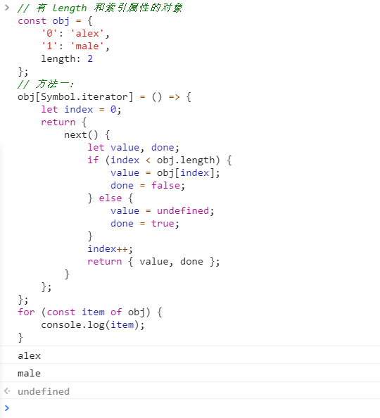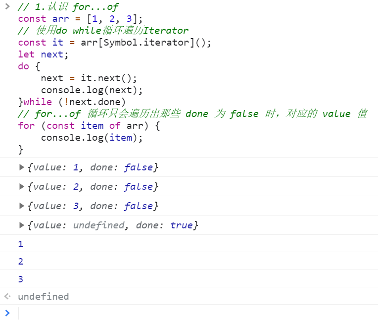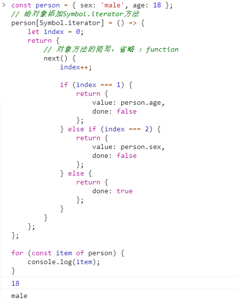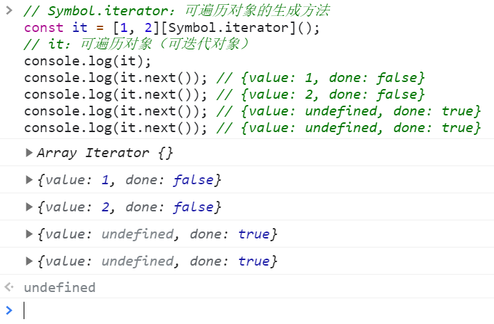 - 具体流程为:Symbol.iterator(可遍历对象的生成方法)→ it(可遍历对象)→ it.next() → it.next() → ...(直到 done 为 true)。