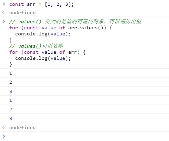 - values() 得到的是值的可遍历对象,可以遍历出值。