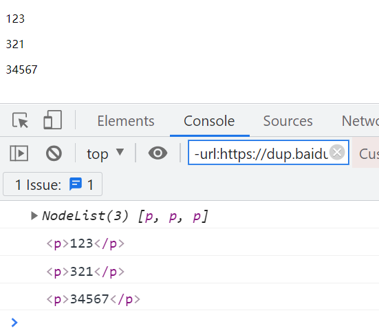 <!DOCTYPE html> <html lang="en"> <head> <meta charset="UTF-8" /> <title>for of遍历</title> </head> <body> <p>123</p> <p>321</p> <p>34567</p> <script> const nList = document.querySelectorAll('p'); console.log(nList); for (const elem of nList) console.log(elem); </script> </body> </html>