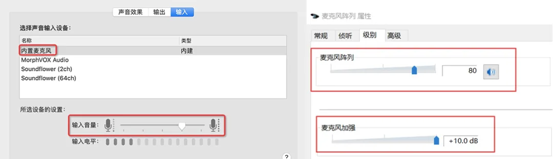 图 3 左:MAC 端模拟增益调节 右:Windows 端麦克风阵列自带的增益能力
