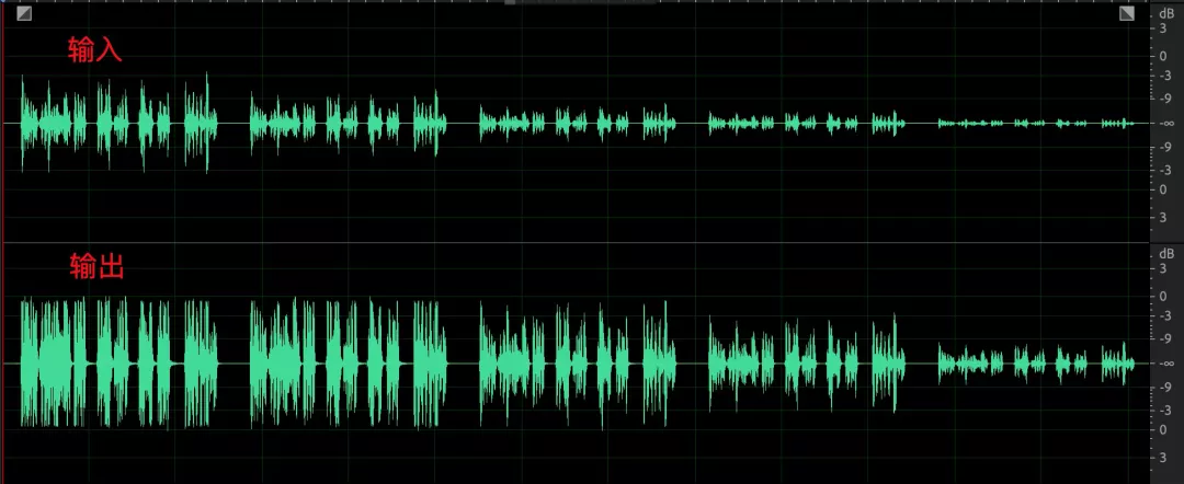 - 模拟增益调节之后,采集的音频信号音量存在起伏,经过数字部分均衡后音频包络保持较好,音量整体一致;