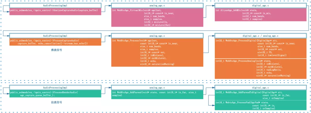 - 在数字增益之后,新增了模拟增益更新模块:WebRtcAgc_ProcessAnalog,会根据当前模拟增益值 inMicLevel(WebRTC 中将尺度映射到 0~255)等中间参数,计算下一次需要调节的模拟增益值 outMicLevel,并反馈给设备层。