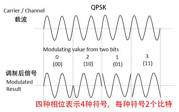 QPSK信号的载波信号有 4 个离散相位状态,每个载波相位可以携带 2 bit 数字信息。