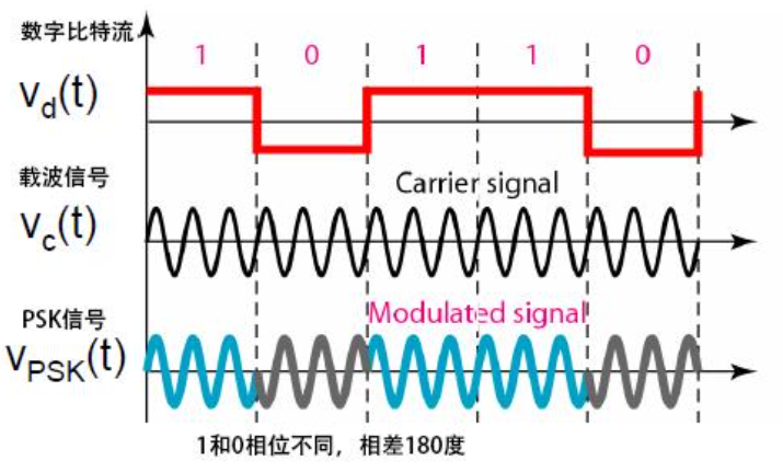 相位调制:通过改变载波信号的相位,使其传输数字信号(0 和 1)。