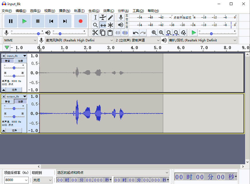 上面一行是未处理的原始音频数据,下面一行是自动增益处理后的音频数据,还是有一个明显的放大效果。