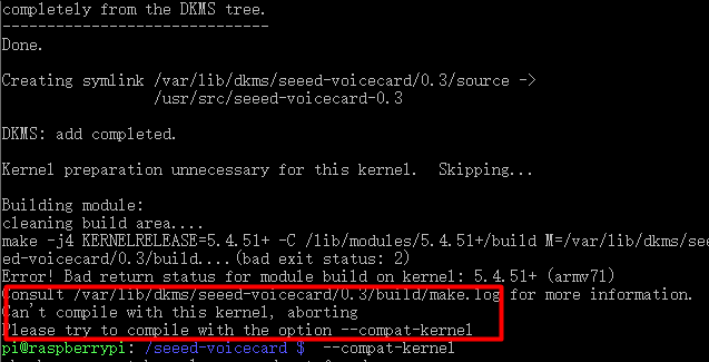 下图为树莓派安装失败的提示:它让你在“sudo ./install.sh”命令后加入 “ --compat-kernel”