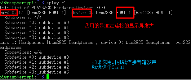 A10:如果你们遇到HDMI连接电脑显示屏,完事树莓派再外接音箱(想靠它发声),然后录音没问题,播放的时候没声音这样的情况。大多数是声卡设置的时候没设置好。被系统默认成音频走HDMI,即电脑显示屏发声了。这时候要么把外接的音箱接到显示屏上去,要么就认真阅读理解我的“第二步”,把CARD值改成树莓派音频输出。然后就可以了。