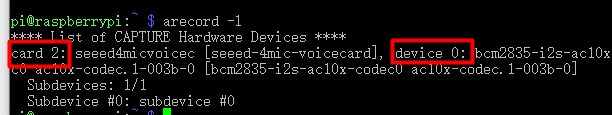 这个号,在程序中,表示为“hw:2,0”。当然如果你用的别的USB麦克风,你不用装Seeed驱动,直接也是记住声卡号就行了。普通的单声道麦克风不如四阵列清晰。