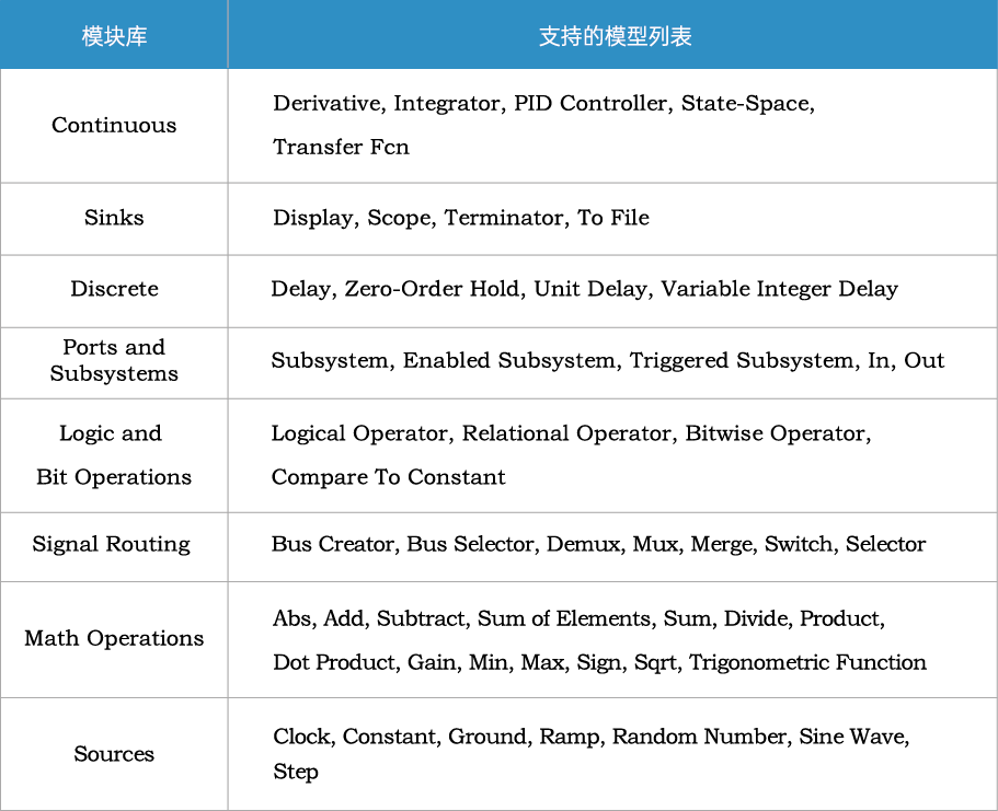最后,向大家介绍一个形式化验证的代码生成工具ModelCoder,由迪捷软件自主研发,支持多种嵌入式系统建模并可以自动生成高安全可靠的C代码的软件设计和开发工具。对标产品有国外ANSYS公司的SCADE或者MathWorks公司的MATLAB/Simulink。ModelCoder支持同步数据流以及状态机等嵌入式模型,其从模型生成代码的过程经过了形式化验证,以保证生成过程的正确无误性,能够用于飞行控制系统,航空电子系统,核电的DCS等多个安全关键领域的嵌入式软件的设计和开发。ModelCoder支持的算法模型见下表: