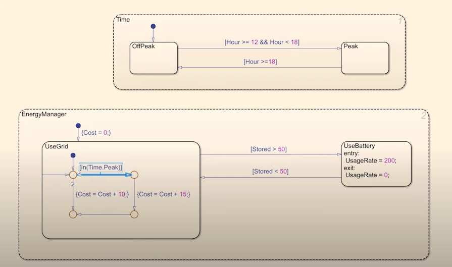 在运行过程中,上面的Time子状态和下面的EnergyManager子状态会同时运行,并且simulink会根据其内部变量的依赖关系自动确定其运行顺序,以确保控制逻辑的正确。