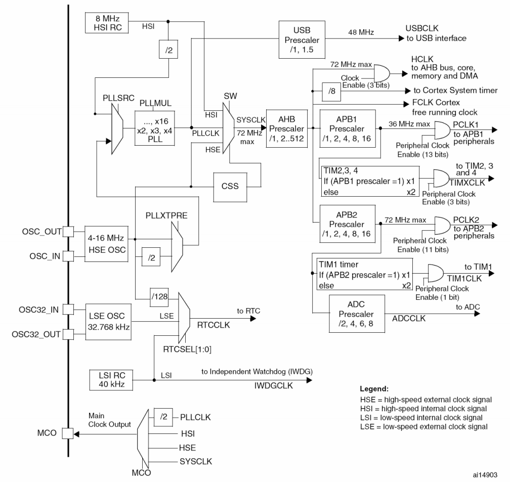从上面的引脚图可以看出,STM32可以外接两个晶振。其中8M晶振就是单片机CPU运行用的,虽然晶振频率只有8M,但其内部频率最高可以达到72MHz,这得益于其内部的分频器,将8M震荡频率经二分频就得到了16M,经过多次分频就能得到更高的频率。