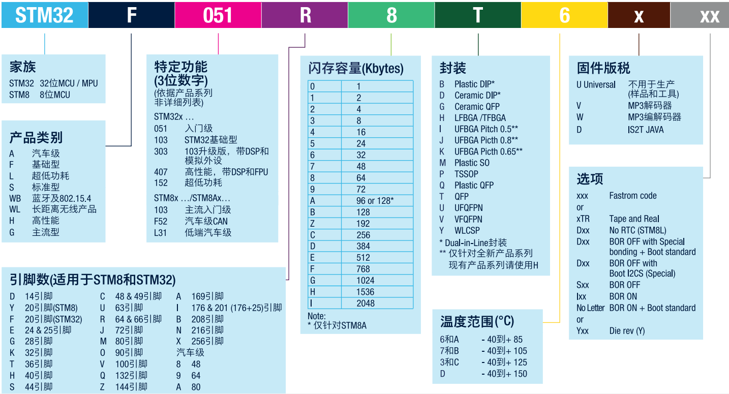 STM32型号很多,所以有着规范的命名规则,从其型号便可知道其部分参数,如产品类型,Flash容量,封装。